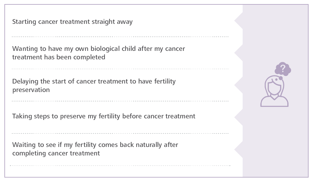 Completing this task may help you think about which fertility preservation option best suits you and your lifestyle at this time. It might be helpful to talk about your choices with your cancer care team and fertility care team, partner, family and friends.